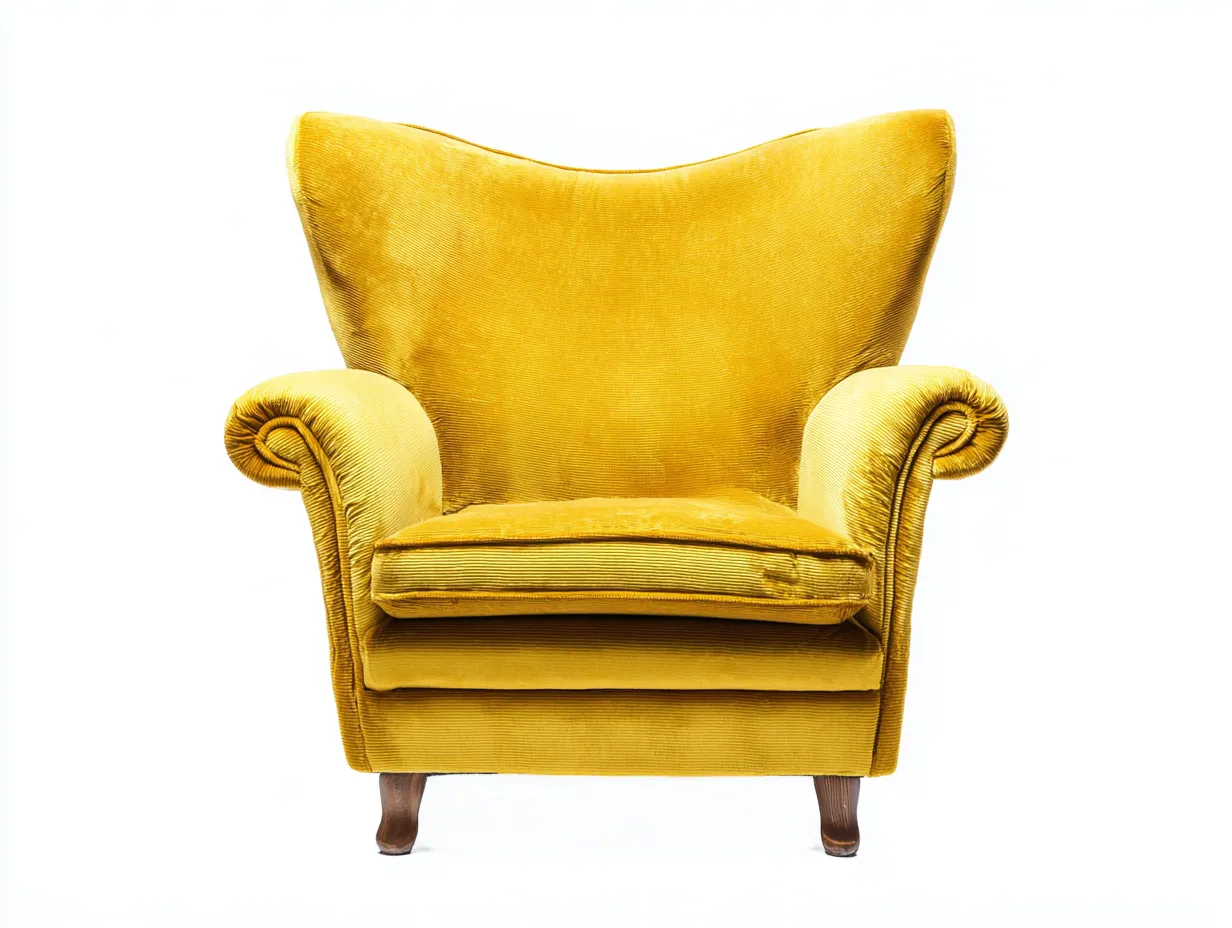 Der Sessel ist mit einem Stoffbezug in Gelb ausgestattet. Das stabile Holzgestell gewährleistet Standfestigkeit und Langlebigkeit, während die gleichmäßig verarbeitete Polsterung für angenehmen Sitzkomfort sorgt.